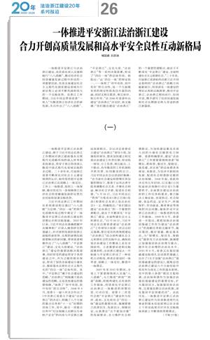 一体推进平安浙江与法治浙江建设,是我省在深入实施和践行“八八战略”,推动经济社会持续健康发展过程中形成的一项重要经验,也是全面建设社会主义现代化国家建设省域先行新征程上必须不断巩固和放大的一个实践优势。在浙江工作期间,习近平同志带领省委“一班人”为推进浙江经济社会的新发展,先后作出了“八八战略”、“平安浙江”、文化大省、“法治浙江”等一系列决策部署,形成了“四位一体”的总体布局。他指出:“这‘四位一体’的辩证统一,……体现了‘你中有我、我中有你’的互动性,每一个方面既有质的规定性和各自丰富的内涵,同时又相互联系、相互依存、相互作用。”在2006年省委作出建设“法治浙江”决定时,他又强调:“我们提出建设‘法治浙江’的一个重要的着眼点,就在于不断深化‘平安浙江’建设、全面构建社会主义和谐社会。”二十年来,历届浙江省委始终沿着习近平同志指明的“法治浙江”战略方向砥砺前行,持续深化一体建设的理论认知和实践探索,推动平安浙江、法治浙江相向而行、协同并进,携手谱写了经济快速发展和社会长期稳定两大奇迹的浙江新篇章。
