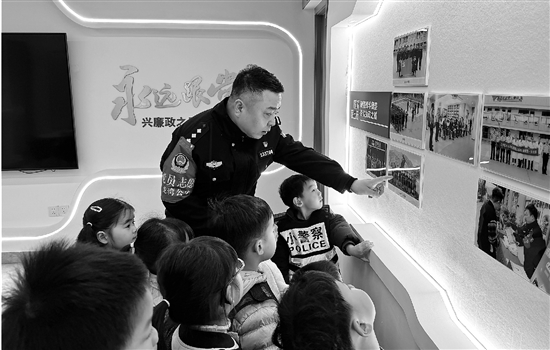 近日,14名幼儿园小朋友走进温州龙湾公安瑶溪派出所。党员民警吴国良带领小朋友们参观了接警大厅、装备库、思政厅等地,用生动语言讲述了警察职责等内容,寓教于乐地为孩子们“解锁”了警营生活。