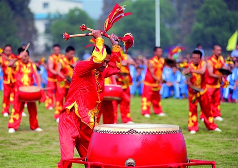 冯华国(化名)卖力地击打着锣鼓。一身红色的衣服,显得格外精神。