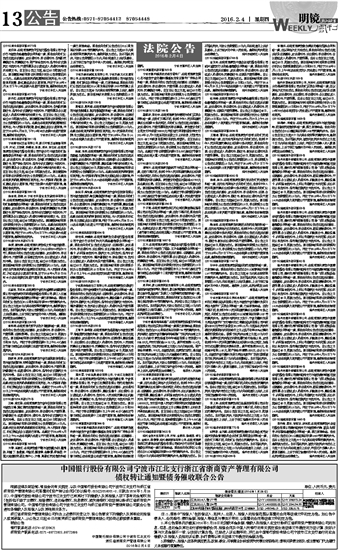 陈志根、胡利冲、宁波市民营企业贷款担保有限公司:本院受理原告招商银行股份有限公司宁波分行与被告你们金融借款合同纠纷一案,现依法向你们公告送达起诉状副本、应诉通知书、举证通知书、(转普)民事裁定书、民事裁定书、财产保全告知书、适用令状式裁判文书告知书、开庭传票及合议庭组成人员通知书等相关法律文书。自发出公告之日起,经过60日即视为送达。提出题答辩状和举证的期限分别为公告期满后的15日内。本案由本院审判员郎素娣担任审判长,与人民陪审员阮敏、陈红彪组成合议庭审理,并定于2016年4月26日下午14时在第六法庭开庭审理,逾期将依法判决。宁波市江东区人民法院