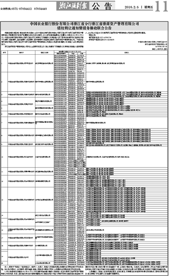 中国农业银行股份有限公司浙江省分行浙江省浙商资产管理有限公司 债权转让通知暨债务催收联合公告