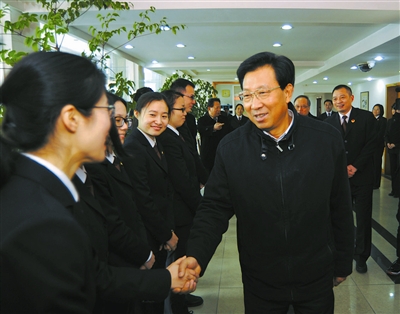 | 王辉忠亲切慰问检察官 本报记者 陈立波 摄 |