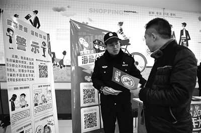 近日,海盐县公安局武原派出所组织民警走街串巷开展走访宣传活动,向市民传授春节防盗、防抢、防骗、防火等安全防范常识和技巧,确保大家平安过节。图为民警正在向市民宣传如何防范通讯(网络)诈骗。