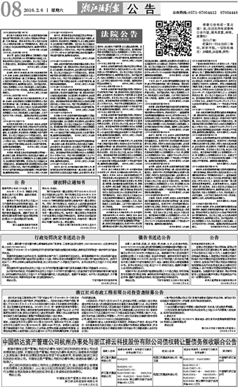朱茂通:本院受理中信银行股份有限公司杭州分行诉你信用卡纠纷一案,现依法向你公告送达起诉状副本、应诉通知书、举证通知书、开庭传票、合议庭通知等诉讼材料。自发出公告之日起,经过60日即视为送达。提出答辩状和举证的期限分别为公告期满后15日和30日内。并定于举证期满后第四日上午9时15分(遇法定假日顺延)在本院第十六号法庭开庭审理,逾期将依法缺席裁判。杭州市上城区人民法院