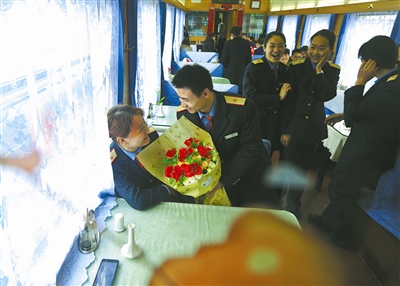2月14日,情人节,在南昌开往北京的T147列车上,列车员王琦将一束玫瑰花送给同为列车员的女友李露(左一),表达浓浓的爱意。
