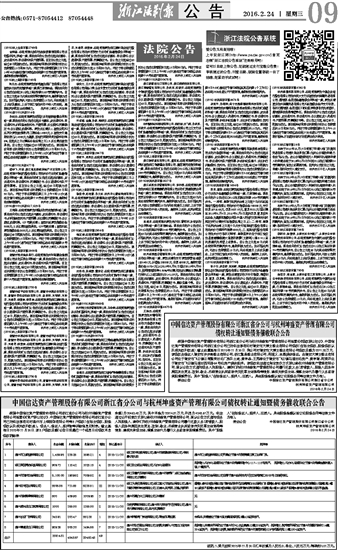 特此公告中国信达资产管理股份有限公司浙江省分公司