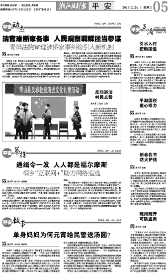 本报讯 “张警官,今天是元宵节,我特意带了汤圆过来,祝你元宵节快乐!也谢谢你让我拿到了户口簿……”昨日,金女士特意赶到海盐县公安局元通派出所接待大厅,将一大袋汤圆送给民警张建利。张建利婉言拒绝了她的好意。