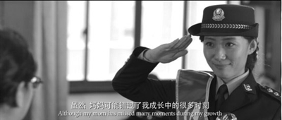 “虽然妈妈错过了我成长中的很多关键时刻,但我知道,身为一名警察,她已经把那些对我的爱,传递给了每个有需要的人,我为妈妈感到骄傲。长大后,我希望成为像妈妈这样的女警,勇敢、正义、无私,让妈妈也为我感到骄傲!”影片中,一位“女警”做出标准的敬礼动作,眼泪在眼眶里直打转……最后,影片在一位母亲的微笑中缓缓收尾。