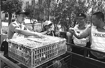 前一天下午1时许,小浦公安检查站刘春松警官在安检车道上例行检查时,发现快速通道地面上有一个塑料筐,刘春松立即警觉了起来。走近一看,原来是一筐活鸡,经过清点共有10只。刘春松判断这应该是过往的车辆掉落的,就叫来同事一起将鸡抬至阴凉处等待处理。
