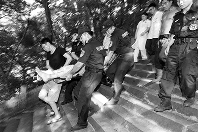 医护人员现场紧急处理后,由民警、热心群众和公园保安组成的营救组接力抬伤员下山。经过2个多小时的救援,他们终于将伤员抬到山脚,送上了救护车。此时,大伙儿身上的衣服已经被汗水湿透了。