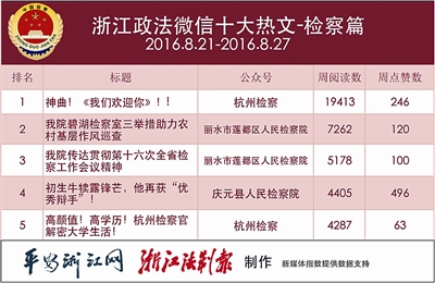 再看热文榜,“杭州检察”的《神曲!〈我们欢迎你〉!!》以19413的周阅读数遥遥领先,一枝独秀。这首由杭州检察干警作词、省市区三级检察院“男神”“女神”演唱的神曲吸粉无数。如此费心思的原创作品,不拿冠军不科学啊!