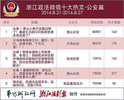 再看热文榜,“萧山公安”的《头条 | 萧山人再不去就过期了!最新汇总的G20旅游优惠全在这里了!》以周阅读数86901的优异成绩,排名第一;“义乌公安”的《义乌所有持有工行、建行、农行、农信卡的,十万火急!!!》吸引了众多眼球,排名第二。看来,实用型微信还是非常受欢迎的,靠这个保住甚至上升位次,是明智之选。
