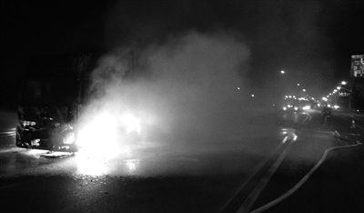 消防官兵赶到现场时,起火的集装箱货车后方马路上,凝固着一条很长的铝块。经过指挥员现场勘查了解,起火集装箱货车上装载了4个熔炉的铝水,并仍在不断向外泄漏,现场的马路上不断有铝水向周边流淌凝固。