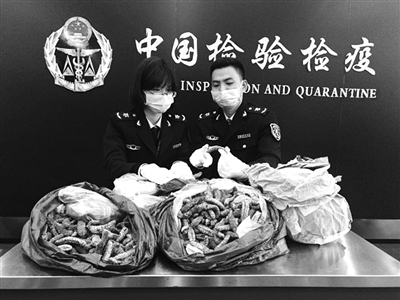 本报讯 1月3日,温州空港口岸检验检疫工作人员从乘坐由罗马入境的意大利旅客行李中截获10袋海参共计24.13公斤,创下温州空港口岸单次截获海参重量之最。