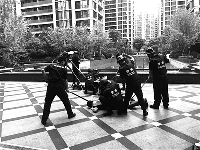 本报讯 近日,杭州市拱墅区祥符街道申慧社区的安保人员在监控屏幕中发现,2个背着黑色书包的陌生男子从东侧铁栅栏翻入小区。监控人员立即呼叫巡逻人员前去查看。“请问你们到哪里去?”巡逻人员刚发问,那2名男子便焦躁不安起来,其中一人还从书包里拿出器械又打又砸。小区里来了暴徒?原来,这是申慧社区联合祥符派出所、绿城物业开展的一次防暴应急演练。