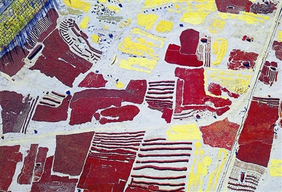仲秋时节,新疆焉耆盆地的巴音郭楞蒙古自治州各县和新疆生产建设兵团30余万亩各种辣椒进入采摘、晒干、分离高峰期,人们将大量的红辣椒铺在沙滩、农家空地晒干,满地铺开的红辣椒一片挨着一片,一眼望不到头,成为了深秋焉耆盆地一幅幅美丽的画卷。