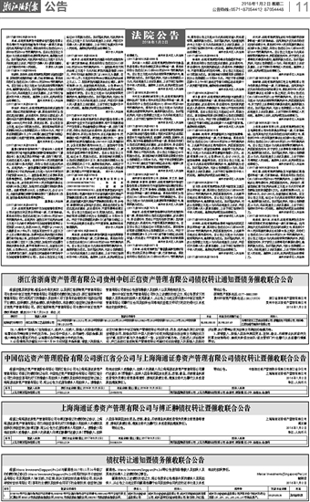 中国信达资产管理股份有限公司浙江省分公司与上海海通证券资产管理有限公司债权转让暨催收联合公告