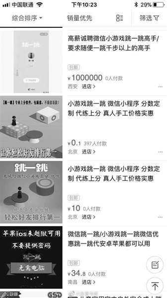 近日,微信发布了V6.6.1新版本,新增了一系列小程序游戏,其中,游戏“跳一跳”颇受玩家欢迎。该游戏每周更新一次的分数排行榜激发了一些玩家的刷分热情,更有甚者直接求助于人工代玩或程序代玩,购买刷高分服务。记者发现,选择代玩服务的玩家可能面临封号,与此同时,由于代玩期间,代玩者需登录买家微信号,因此买家的账号安全问题也不容忽视。