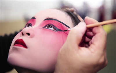 图为1月2日,京剧老师在给一名西场小学学生化妆。
