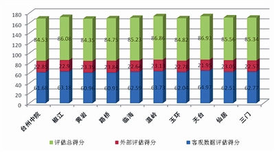卢益民介绍,从外部评估结果看,司法公正、司法质量、司法效率、司法便民、司法服务、司法作风、司法廉洁等17项计分内容,基础平均分都达到89分以上。其中,路桥法院外部评估的基础平均分为95.34分,全市最高。“从社会民众对法院的17项内容的评价看,台州两级法院整体工作的公平公正获得满意率最高。”