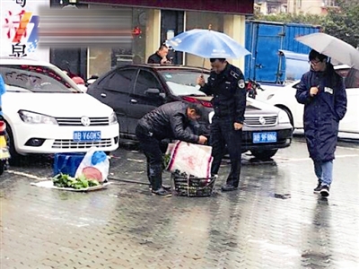 照片中,一名穿着城管制服的男子举着一把蓝色雨伞。伞下,一位大爷正在收拾摆在地上的蔬菜。“没有面红耳赤的争执,没有推推搡搡的抢夺,只有包容与体谅,画面温馨又和谐。”朋友圈里,网友纷纷叫好、点赞。