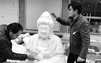 陕西省西安市蓝田县迎宾路玉雕大世界内,几位从事玉雕的师傅玩起了堆雪人,俗话说:“大师出手,必定与众不同。”因为常年从事玉石雕刻,几位师傅用雪人堆了关公雕像、坐姿优美的观音菩萨,还有喜笑颜开的大肚弥勒佛。几座雪人惊呆路人。