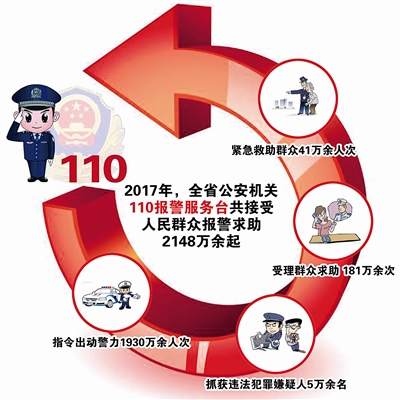 在第32个“110”宣传日上,回首刚刚过去的2017年,全省公安机关110报警服务台共接受人民群众报警求助2148万余起,指令出动警力1930万余人次,抓获违法犯罪嫌疑人5万余名,受理群众求助 181万余次,紧急救助群众41万余人次。