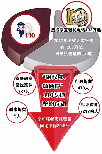这些电话占用了宝贵的110线路和警力资源,使急需救助的群众得不到及时救助,直接危及了群众的生命财产安全。为保障这一“生命通道”的畅通,2017年以来,全省各级公安机关组织开展“树权威、畅通道”110专项整治行动,共查处恶意骚扰案件737起,刑事拘留5人,行政拘留478人,批评教育7217余人,全年骚扰类报警量同比下降20.5%。