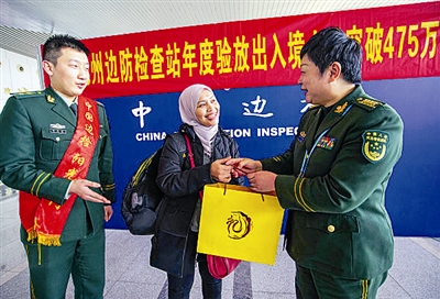 “祝贺您,您是我们今天的幸运旅客!” 1月10日,杭州边防检查站站长王红热情地给来自马来西亚的阿卜杜勒·拉合曼女士送上了纪念品。新年伊始,为让来自世界各地的友人感受到边检服务的热情,杭州边防检查站相继开展了“与外国友人牵手”“春风送暖”等活动,拉近了与旅客的距离。