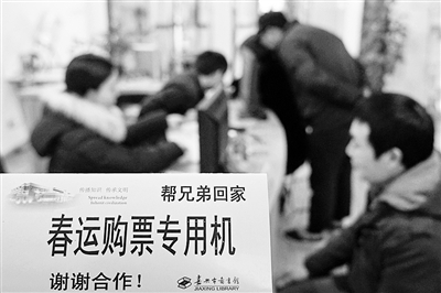 1月14日,嘉兴图书馆“帮兄弟回家”网购火车票服务专区,工作人员在电脑上帮新居民抢购春运火车票。嘉兴图书馆同时培训乡镇图书馆工作人员,为新居民就近提供免费网络购票服务。金鹏 摄