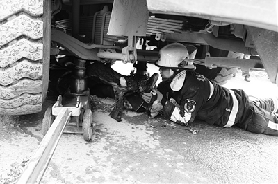 消防官兵赶到现场时,被困男子和电动车仍被死死卡在车头右下方底部,男子受伤严重。经现场勘查,一组官兵利用千斤顶顶起车头,另一组官兵深入车底先将被卡电动车拖出,然后将被困男子救出后由120急救车送往市二医院救治。