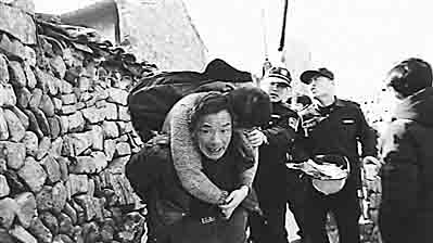 以前都是消防员背着群众出火场 这次是村民背着消防员送去医院