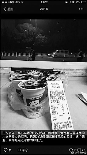 寒冬执勤民警收到6杯奶茶 背后故事很暖心