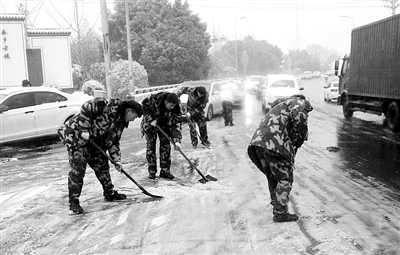 事实上,为了尽快将积雪铲除,给予行人方便,昨天,各地消防官兵陆续行动起来。上午6时,德清县新市镇乐安大桥上积雪严重,德清县新市镇消防综合应急救援队出动1辆消防车14名队员,一边向积雪路段撒盐,一边清除积雪,确保市民出行安全。