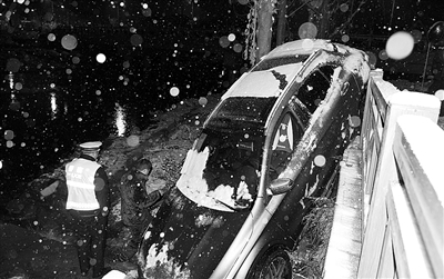 司机刘女士告诉记者,当时她是开车回家,经过这个弯道时由于路面冰雪积得较多,车子转弯时感觉车速有点快,就踩了一脚刹车,结果车子突然就失控冲出了路面,挂在了护栏与河提之间,她坐在车内不敢动弹,直到救援人员将自己救出。