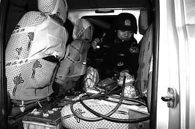 1月24日夜间,台州市公安局椒江分局组织治安、特警、交警、派出所等多警种在案件高发地段开展设卡巡逻盘查行动,重点对过往的可疑人员、车辆、物品等进行仔细检查,严防盗抢案件发生。图为民警检查车内物品。通讯员 何文斌