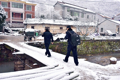 1月26日上午,上虞区公安分局章镇派出所民警陈洪江冒雪到岭南乡立功村走访。他是岭南乡的社区民警,背包里有户籍资料、急救包、防范宣传册等社区民警的必备资料,随时为群众提供服务。