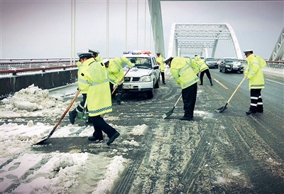 雪后,绍兴市交警支队的交警们,在积雪较多的路段放置警示标志,提醒过往车辆行人注意安全。袍江大队还专门为冒雪前来办理业务的群众准备了姜茶,驱除寒意。