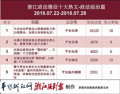 本期政法委榜单中,“平安乐清”表现不俗,3篇文章包揽了热文的前三名。当中最受关注的是《中央决定铲除这12类黑恶势力和25类帮凶,乐清公布举报电话!》一文。铲除黑恶势力,我们是认真的!