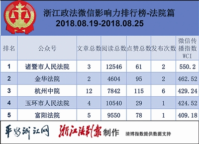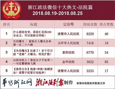 本期法院热文榜的前三,分别被“诸暨市人民法院”“玉环市人民法院”“富阳法院”的文章摘取。其中,“诸暨市人民法院”的《什么都没有变,原星汇花苑499名业主,可以签新合同啦!》凭借地缘性引起广泛关注,收获阅读数近万。