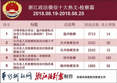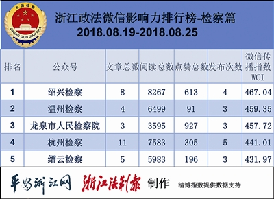 本期检察院热文榜上,各公号热文收获的阅读数相近。其中最热的是“温州检察”的《市领导批示肯定!温州检察机关这项工作是怎么做到的?【544期】》一文,温州检察机关化解矛盾纠纷的做法被上级检察院推广,可喜可贺!
