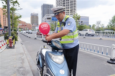 这是小贩卖气球,还是附近商家搞活动?走近一看,气球上写几个字:“文明出行,请勿违停”。原来,这是当地交警系的气球,那些被系上气球的电动车有一个共同点——停在了不该停的地方。