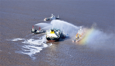 演习模拟的情景是:在舟山外海水域,一艘载有20万吨原油、19名船员的外籍油船“A”轮,与一艘外籍集装箱船发生碰撞,导致“A”轮爆炸起火,19人遇险,超过1000吨原油泄漏入海。