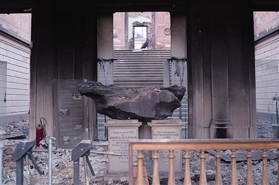 记者在现场隔离带外侧向博物馆主楼望去,只看见一块陨石标本孤独地立在博物馆一进门的大厅处,除此之外只剩断壁残垣。