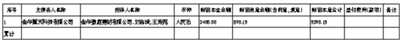 | 注:1.清单中“担保人”包括保证人、抵押人、出质人,担保人的担保范围以签署的合同等法律文件约定为准。如公告中债务人、合同编号、债权金额、担保人等信息与事实不符的,以签署的合同等法律文件约定为准。 2.上述标的债权明细表为截止基准日(即[2018]年[7]月[16]日)标的债权账面本金余额、账面利息余额等的暂估金额,如与法院裁判文书或按标的债权文件约定方式计算金额不同,则以该等法院裁判文书或债权文件确认的方式计算至基准日为准。 3.若借款人、担保人因各种原因更名、改制、歇业、吊销营业执照或丧失民事主体资格的,请相关承债主体或主管部门代位履行义务或履行清算责任。 4. 目前转让方已受偿21410993.37元(具体以人民法院的领款材料为准)。 标的债权明细表 金额 万元 |