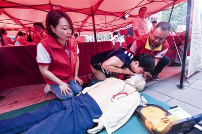 9月8日,中国红十字会志愿者、浙江省红十字会应急救护培训讲师闵华(前右)在活动现场指导市民学习急救知识。