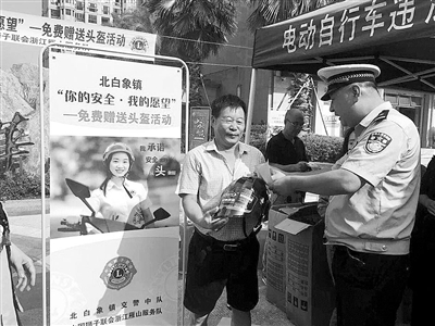 近日,乐清交警联合中国狮子联会浙江雁山服务队在北白象镇开展“你的安全,我的愿望”赠送头盔活动,向来往骑行群众免费发放安全头盔。今年以来,乐清交警已累计向市民免费发放2万余顶安全头盔。通讯员 余甘棠 摄