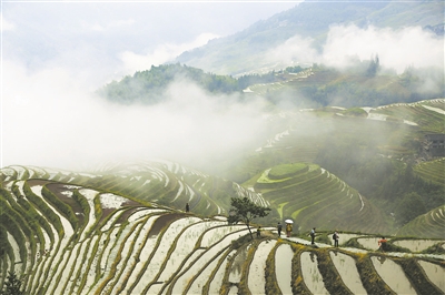 雨后的广西龙胜各族自治县龙脊梯田云雾升腾,村寨、梯田在云海中若隐若现,美如仙境。