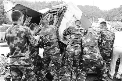昨天上午8时许,一辆满载生活垃圾的垃圾车在武警温州支队文成中队驻地附近侧翻,环卫工人被压在车底。紧急时刻,中队长马上集合中队官兵出发救援,协力将人从车下救出。待救护车到达现场后,中队官兵对现场道路进行封控,确保救护车顺利赶往医院进行救治。 通讯员 张新磊