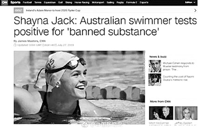 澳大利亚游泳协会27日晚证实,该国女选手沙·杰克在6月26日的赛外兴奋剂检查中出现阳性结果,澳媒称:“绝对的灾难”。澳游泳协会在声明中说,按照相关规定,当时在得知这个结果后,协会对这名选手进行临时禁赛,相关人员陪她从在日本的一个训练营返回澳大利亚,她也无法参加7月12日在韩国光州揭幕的国际泳联世界游泳锦标赛。此前,在韩国光州游泳世锦赛上,澳大利亚选手霍顿曾以质疑对手有违规行为为由,拒绝与冠军孙杨一起登上领奖台。